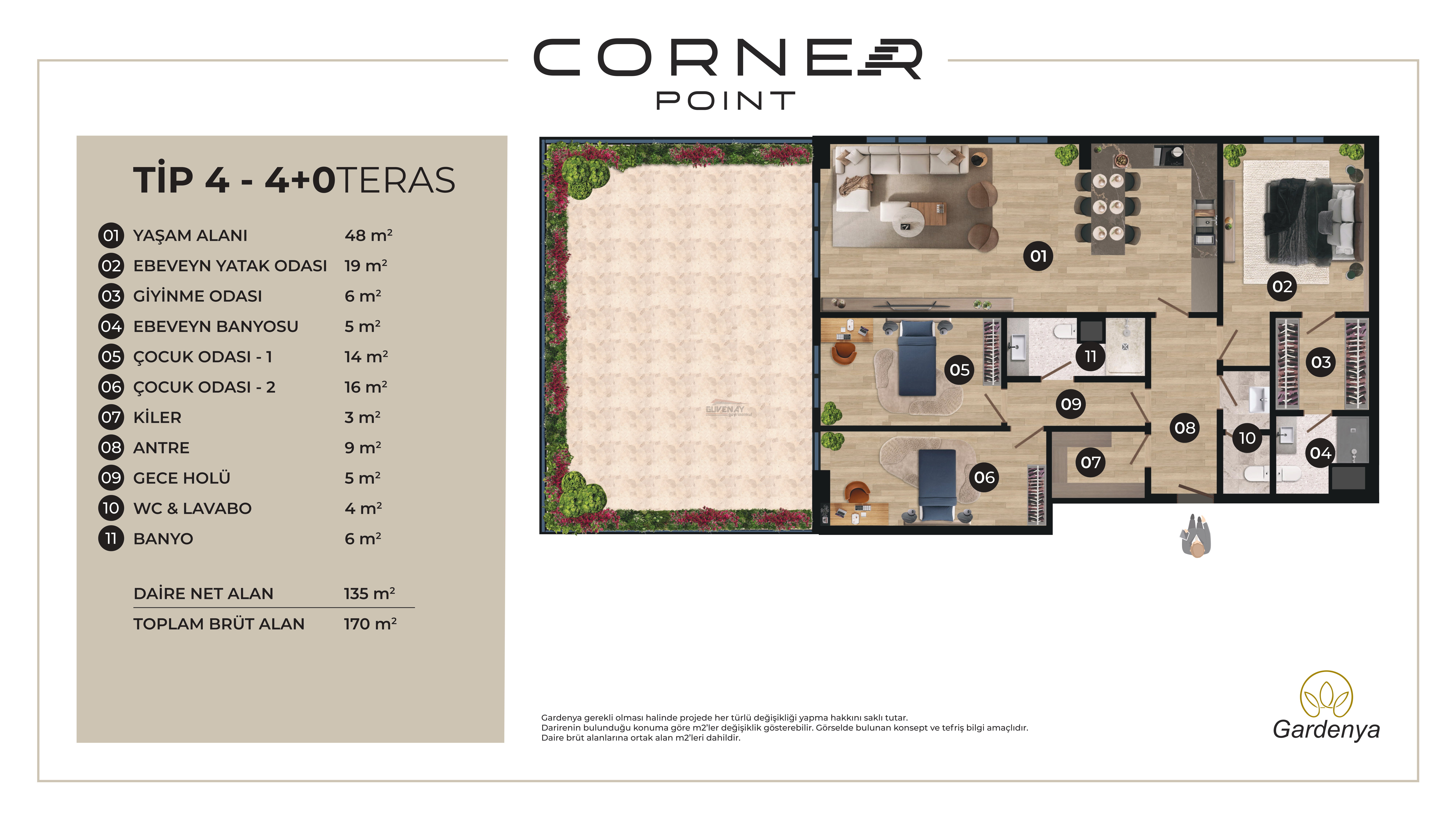 Dairemiz, büyük aileler için ideal olan 4+0 plan tipinde olup, 135 metrekare net kullanım alanına sahiptir. Konforunuz için lüks detaylar arasında; size özel keyif alanı sunan Teras, hijyen ve mahremiyet sağlayan Ebeveyn Banyosu ve depolama kolaylığı sağlayan kullanışlı bir Kiler bulunmaktadır.