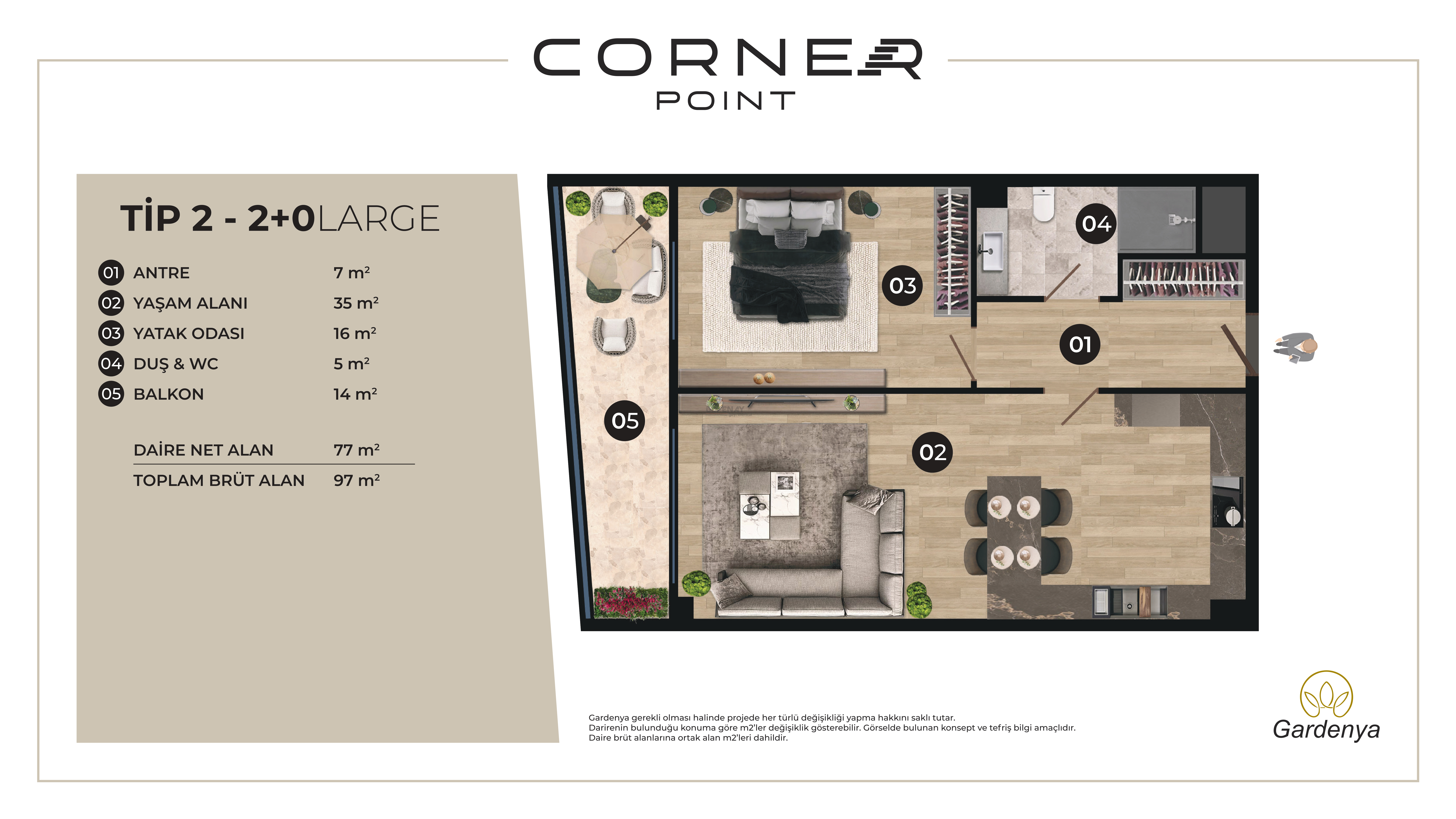 Dairemiz, ideal bir yaşam alanı sunan 2+0 plan tipindedir ve 77 metrekare net kullanım alanına sahiptir. Ayrıca, dinlenmeniz ve keyifli anlar geçirmeniz için tam 14 metrekarelik geniş bir balkonu bulunmaktadır.