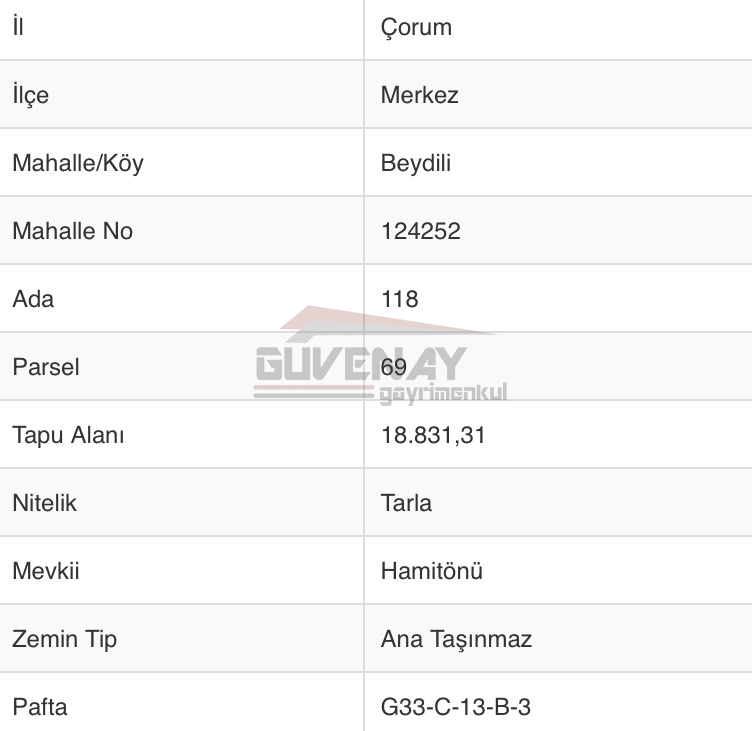 Çorum Şehir Merkezi'ne sadece 11 KM MESAFEDE (Araç ile 15 DAKİKA), geniş bir alana sahip bu tarla; 18.831 M² yüz ölçümü, tek tapu müstakil parsel olma avantajı ve Kadastrolu Yolunun bulunmasıyla büyük ölçekli yatırım ve tarımsal faaliyetler için ideal bir SATILIK fırsat sunmaktadır.